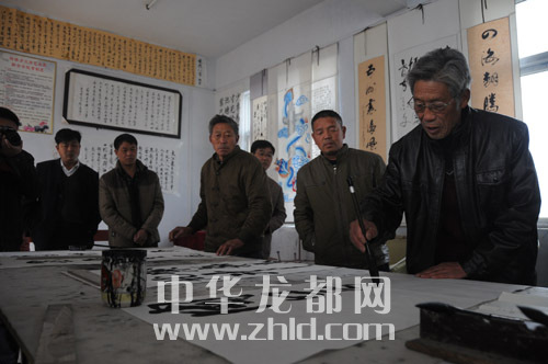 ????作為距離太康縣城最遠(yuǎn)的一個(gè)邊界鄉(xiāng)鎮(zhèn),轉(zhuǎn)樓鄉(xiāng)的文化活動(dòng)開展得有聲有色。該鄉(xiāng)依托文化站,成立了在鄉(xiāng)一級(jí)少見的文聯(lián),下設(shè)書法家協(xié)會(huì)、腰鼓協(xié)會(huì)、嗩吶協(xié)會(huì)等。我們?cè)谵D(zhuǎn)樓鄉(xiāng)政府采訪時(shí),正碰上書法家協(xié)會(huì)20多名會(huì)員在一起切磋書藝。今年74歲的許家榮是鄉(xiāng)書法家協(xié)會(huì)主席,也是《周口晚報(bào)》的老讀者,看到我們到來,老人興之所至,當(dāng)場揮毫潑墨,為本報(bào)題寫了“周口邊界行接地氣有人氣”的條幅。據(jù)了解,每逢春節(jié),書法家協(xié)會(huì)會(huì)員都會(huì)走村串戶,為村民義務(wù)書寫春聯(lián)。