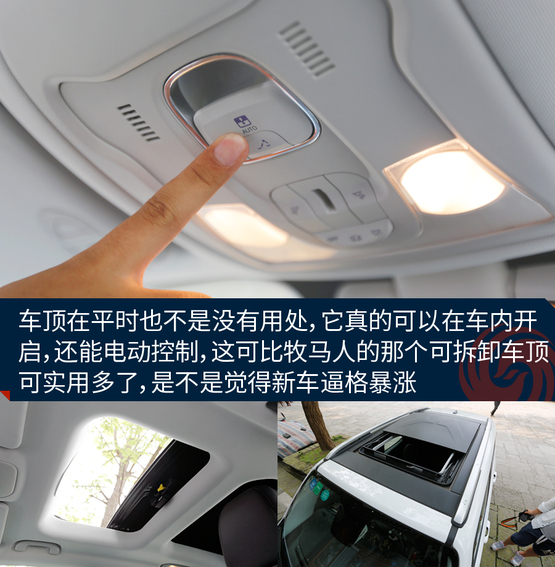 敞篷版車型將普通車型的天窗玻璃全部換成了可拆卸的頂棚,拆卸過程十分方便,即使是女性車主也能輕松拆卸。而且最重要的一點(diǎn)是這個頂棚不只是樣子貨,平時放在車頂時,車內(nèi)可進(jìn)行操作,把它變成一個電動天窗來用,是不是感覺特高端?