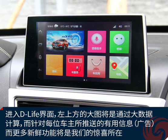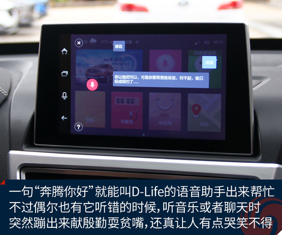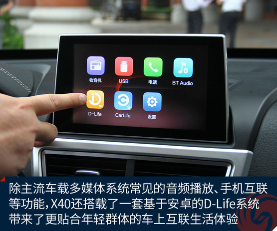 不過(guò)跟奔騰X40接觸兩天之后,會(huì)發(fā)現(xiàn)它大可不必在對(duì)手林立的市場(chǎng)中血拼顏值,靠實(shí)力不俗的獨(dú)門(mén)絕技一樣能夠輕松獲得一席之地。既然面向年輕用戶(hù),豐富的車(chē)載娛樂(lè)系統(tǒng)很關(guān)鍵。大屏幕、手機(jī)互聯(lián)等等似乎已經(jīng)是這類(lèi)車(chē)的標(biāo)配。奔騰X40更進(jìn)一步,所搭載的D-Life系統(tǒng)讓我們看到了它引領(lǐng)潮流的勁頭。