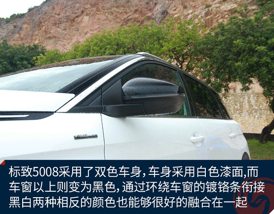 標(biāo)致5008采用了雙色車身,比如我們?cè)囻{的這一輛GT-Line版車型,車身整體采用白色漆面,而車窗以上的部分則變?yōu)楹谏?,通過(guò)環(huán)繞車窗的鍍鉻條銜接,黑白兩種相反的顏色也能夠很好的融合在一起。