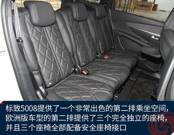 作為一款7座中型SUV,標(biāo)致5008最受關(guān)注的一點(diǎn)就是車內(nèi)空間的體驗(yàn)了,這里我就來(lái)多講一講。首先,標(biāo)致5008提供了一個(gè)非常出色的第二排乘坐空間,不夸張的說(shuō)2840毫米的軸距基本上就是在為第二排乘客服務(wù)的。歐洲版車型的第二排提供了三個(gè)完全獨(dú)立的座椅,并且三個(gè)座椅全部配備安全座椅接口,而國(guó)產(chǎn)車型將會(huì)改為4/6分隔的座椅類型。