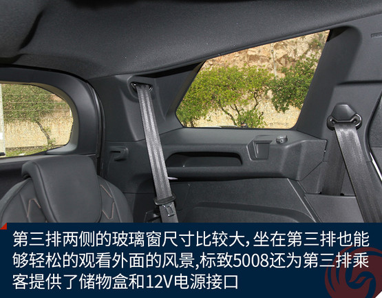 不過(guò)第三排也有值得表?yè)P(yáng)的地方,首先正如前面所說(shuō),由于車身設(shè)計(jì)的比較方正,所以第三排的頭部空間比較理想,并不覺得特別頂頭;另外,第三排兩側(cè)的玻璃窗尺寸比較大,坐在第三排也能夠輕松的觀看外面的風(fēng)景;最后,標(biāo)致5008還為第三排乘客提供了儲(chǔ)物盒和12V電源接口,能夠滿足基本的使用需求。