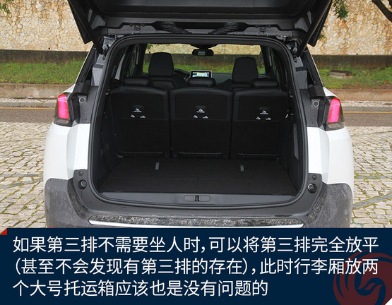 標(biāo)致5008提供了三排座椅還有另外一個(gè)顯著的好處是,可以豐富行李廂的使用方式。通過(guò)實(shí)際體驗(yàn)可以發(fā)現(xiàn),當(dāng)三排座椅全部立起時(shí),標(biāo)致5008的行李廂基本能夠放下兩個(gè)登機(jī)箱,但如果第三排不需要坐人時(shí),可以將第三排完全放平(甚至不會(huì)發(fā)現(xiàn)有第三排的存在),此時(shí)行李廂放兩個(gè)大號(hào)托運(yùn)箱應(yīng)該也是沒有問(wèn)題的。