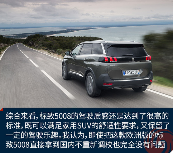 綜合來(lái)看,標(biāo)致5008的駕駛質(zhì)感還是達(dá)到了很高的標(biāo)準(zhǔn),既可以滿足家用SUV的舒適性要求,又保留了一定的駕駛樂(lè)趣。我認(rèn)為,即使把這款歐洲版的標(biāo)致5008直接拿到國(guó)內(nèi)不重新調(diào)校也完全沒有問(wèn)題。