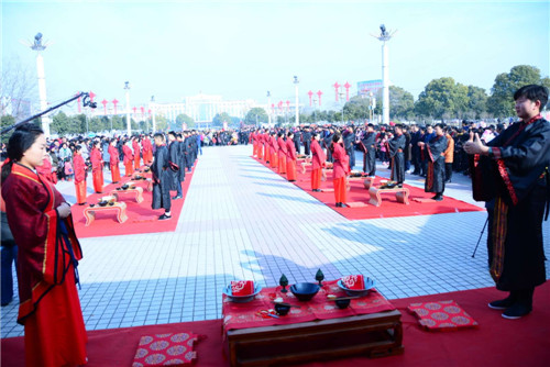 記者在現(xiàn)場(chǎng)看到,16對(duì)新人在司儀的引導(dǎo)下,采用中國(guó)古典婚禮儀式,有牽紅線、結(jié)發(fā)、拜天地等程序,儀式簡(jiǎn)單而隆重,新人家屬、1000多名市民圍觀見證了新人喜結(jié)連理。