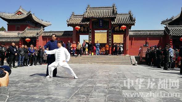 研討會(huì)前,王西安大師率弟子在淮陽(yáng)太昊陵廟太極門前向海內(nèi)外太極拳愛好者傳授拳術(shù)。
