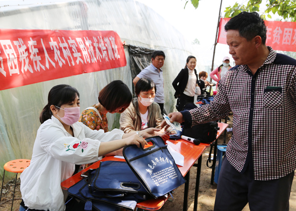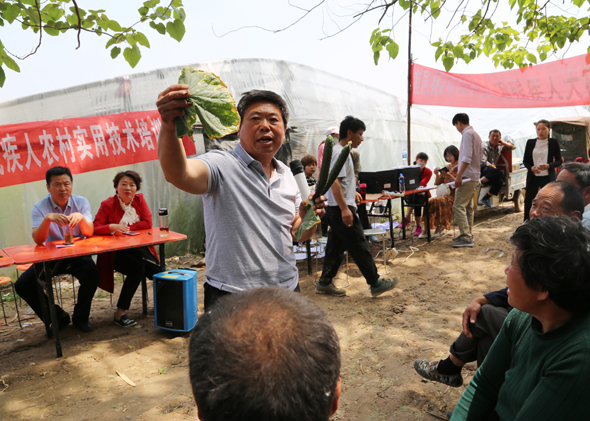 5月10日,在鹿邑縣馬鋪鎮(zhèn)完樓村殘疾人士付天軍的培訓基地——蔬菜種植合作社助殘大棚內(nèi),來自鹿邑縣馬鋪鎮(zhèn)、渦北鎮(zhèn)產(chǎn)業(yè)集聚區(qū)的150多名建檔立卡貧困殘疾人,齊聚這里免費學習黃瓜種植技術,付天軍在大棚內(nèi)手把手地進行指導,來自華陽學校的農(nóng)業(yè)專家李中蘭也應邀在大棚內(nèi)對常見的病蟲害進行詳細講解。