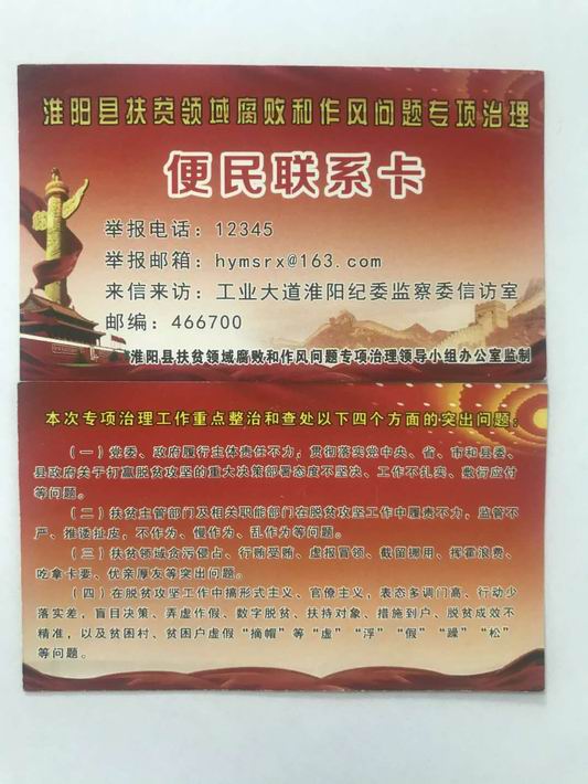 今年4月,淮陽縣扶貧領(lǐng)域腐敗和作風問題專項治理全面啟動。為確保專項治理取得實效,縣紀委監(jiān)委印制發(fā)放“便民聯(lián)系卡”,進一步加大宣傳力度,暢通信訪舉報渠道。他們統(tǒng)一制作的扶貧領(lǐng)域腐敗和作風問題專項治理便民聯(lián)系卡,上面印有專項治理工作重點整治和查處的4個方面內(nèi)容。具體包括黨委、政府履行主體責任不力,脫貧攻堅工作不扎實,敷衍應付;扶貧部門及相關(guān)職能部門脫貧攻堅工作中不作為、慢作為、亂作為等;扶貧領(lǐng)域發(fā)生貪污侵占,虛報冒領(lǐng),截留挪用等問題。聯(lián)系卡公布了舉報電話和來信來訪地址,方便群眾對黨員干部和部門的監(jiān)督。