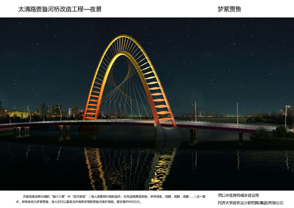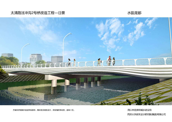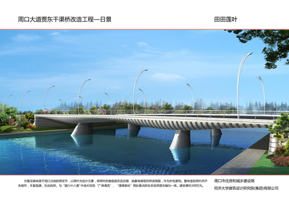 周口大道沙潁河橋景觀改造,設(shè)計(jì)造型簡(jiǎn)單柔美,如行云流水,同時(shí)與沙潁河景觀帶相融合,給城市增添了生機(jī)與活力。周口大道賈東干渠橋以荷葉為設(shè)計(jì)元素,造型簡(jiǎn)約而不失細(xì)節(jié)。周口大道流沙河橋造型簡(jiǎn)潔大氣,線條流暢,像一條青龍游弋在水面上。文昌大道幸福河橋以花瓣、葉子為設(shè)計(jì)元素,造型豐富多彩。文昌大道流沙河故道橋在中分帶位置修建花壇,花壇造型莊重古樸,景石造型端莊沉穩(wěn)。太清路流沙河橋以古建斗拱、窗花為元素,造型儒雅大方。太清路洼沖溝2號(hào)橋以“輻轂相依”為名,既融合環(huán)境,又有團(tuán)結(jié)、合作的寓意。太清路賈魯河橋,增加了景觀造型,使人們可以重溫當(dāng)年賈魯河的美好畫(huà)卷。彭新莊橋以柳葉為元素,預(yù)示著留住賓客與送別親友的不舍之情的雙重含義。