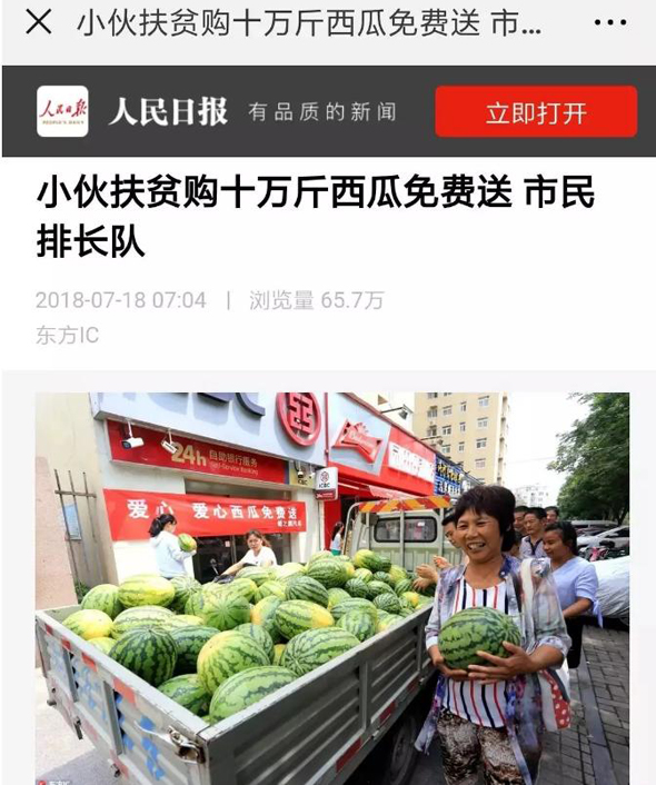 7月18日,《人民日報》客戶端播發(fā)了“小伙購十萬斤西瓜免費送 市民排長隊”的一條新聞,瞬間刷屏朋友圈,一天閱讀量就突破100萬人次,加上騰訊新聞、人民圖片截至19日發(fā)稿時閱讀量已達一百五十萬人次,評論13000多條,人們都在稱贊咱扶溝小伙宋鐵托的善舉,被網(wǎng)友稱他為“愛心西瓜哥”。