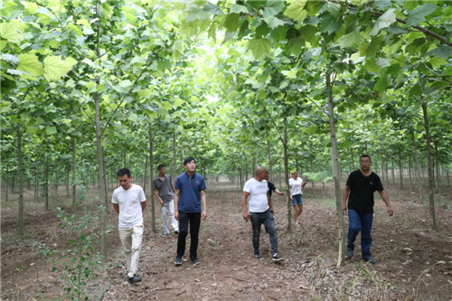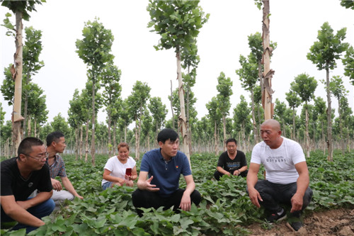 與前廟相鄰的大張村,是一個(gè)“天然大氧吧”。從大張村走出來(lái)的曹紅星在鄭州從事園林綠化多年,在朱口鎮(zhèn)黨委、鎮(zhèn)政府的支持和鼓勵(lì)下,他以1000元/畝的價(jià)格流轉(zhuǎn)了1000多畝土地,種植法桐、欒樹(shù)、國(guó)槐等綠化樹(shù)。有著豐富經(jīng)驗(yàn)的曹紅星在種植綠化樹(shù)的同時(shí),積極發(fā)展林下經(jīng)濟(jì),在綠化樹(shù)下種植紅薯、大蒜等,有效提高了土地的利用率,經(jīng)濟(jì)效益顯著提高?!捌綍r(shí),綠化林地除草、抗旱、施肥需要用工,收種紅薯、大蒜等也需要用工,用工時(shí)貧困戶優(yōu)先。只要有勞動(dòng)能力,來(lái)這里就能掙錢?!辈芗t星說(shuō),林業(yè)經(jīng)濟(jì)的快速發(fā)展為鄉(xiāng)親們脫貧致富提供了保障。