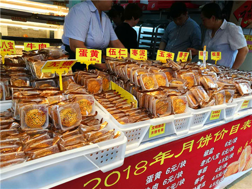 “給我拿兩斤青紅絲酥皮和五仁的?!币晃?0出頭的女士邊付錢邊說,小時候,過中秋節(jié),一家人圍坐一起吃這種半斤重的老式月餅,一個月餅分八塊,一人一塊,現(xiàn)在回想起來,“真甜”!
