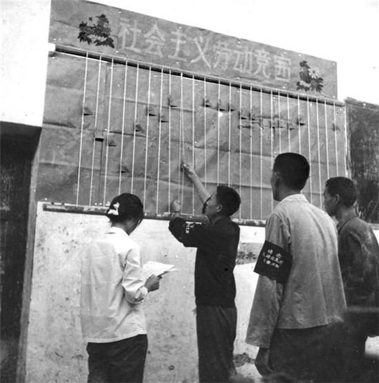 項(xiàng)城工人佩戴黑紗開展社會(huì)主義競(jìng)賽。