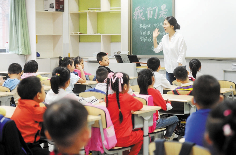 班主任為一年級新生講解課堂紀律和行為規(guī)范。