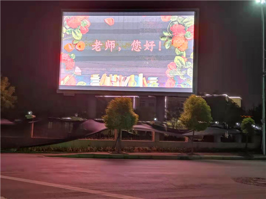 “老師,您好!”9 月10日晚上,鄲城縣人民公園大屏幕上,向全縣教師發(fā)出了溫暖、明亮的祝福。同一時(shí)刻,城區(qū)各主要街道公共LED大屏幕,以及縣一高、三實(shí)小等城區(qū)學(xué)校和石槽一中、秋渠一中等鄉(xiāng)村學(xué)校的顯示屏上,“老師,您好”四個(gè)大字在夜幕下顯得格外的醒目與亮眼。教師節(jié)當(dāng)夜,老師儼然成為了“夜空中最閃亮的星”。
