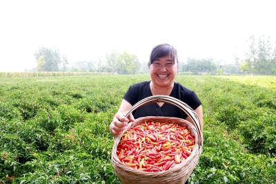 在朱樓行政村,朱高杰、王麗夫妻倆正帶領20多名采摘工人在辣椒田里采摘艷紅、泡椒兩個品種,地頭停放著盛滿辣椒的三輪車和五六個蛇皮袋,火紅的辣椒映襯著小兩口臉上燦爛的笑容:“大豐收呀,這塊地是泡椒,還沒有出地頭,就劃3.8元一斤了,走向市場至少五六元錢。咱吃的泡椒鳳爪、泡椒罐頭,都是這做的。像那塊地的艷紅,就像它的名字一樣又紅又鮮艷,出地頭就得七八塊,賣到市場上都10多元一斤,主要賣到四川、湖北等地,這是火鍋底料、炒菜的必備品,這是個炒出來有香味的辣椒品種?!蓖觖惸苷f會道,而且在她的帶動下,全鄉(xiāng)許多親朋好友都在種植辣椒。像王麗一樣,汲水鄉(xiāng)種植辣椒面積突破了1萬畝,整個鄲城縣種植辣椒突破5萬畝。