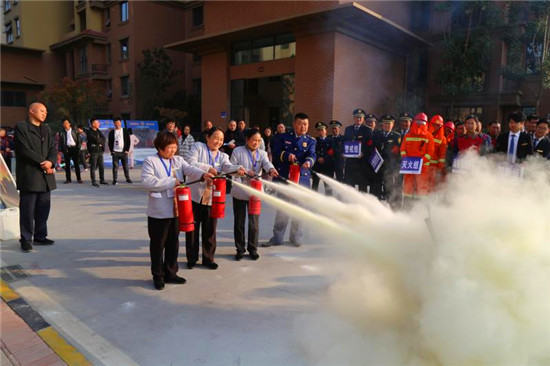 記者在現(xiàn)場看到,隨著消防警鈴的響起、煙霧的彌漫,來自物業(yè)公司和社區(qū)的數(shù)十名群眾彎著腰,同時用濕毛巾捂著口鼻,緊急而有序地從步梯撤出,與此同時,消防隊(duì)員迅速將消防水袋和槍頭同消防栓相連接,并打開消防栓對準(zhǔn)“火勢”,一瞬間,發(fā)生在建業(yè)社區(qū)的一場“火災(zāi)”被及時撲滅,現(xiàn)場圍觀的眾人爆發(fā)出陣陣掌聲。