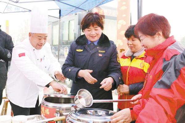 1月2日,在太康縣城人民廣場(chǎng),來(lái)自社會(huì)各界的志愿者為環(huán)衛(wèi)工人端上熱氣騰騰的包子和臘八粥,讓環(huán)衛(wèi)工人溫暖過(guò)節(jié)。圖為臘八粥發(fā)放現(xiàn)場(chǎng)。