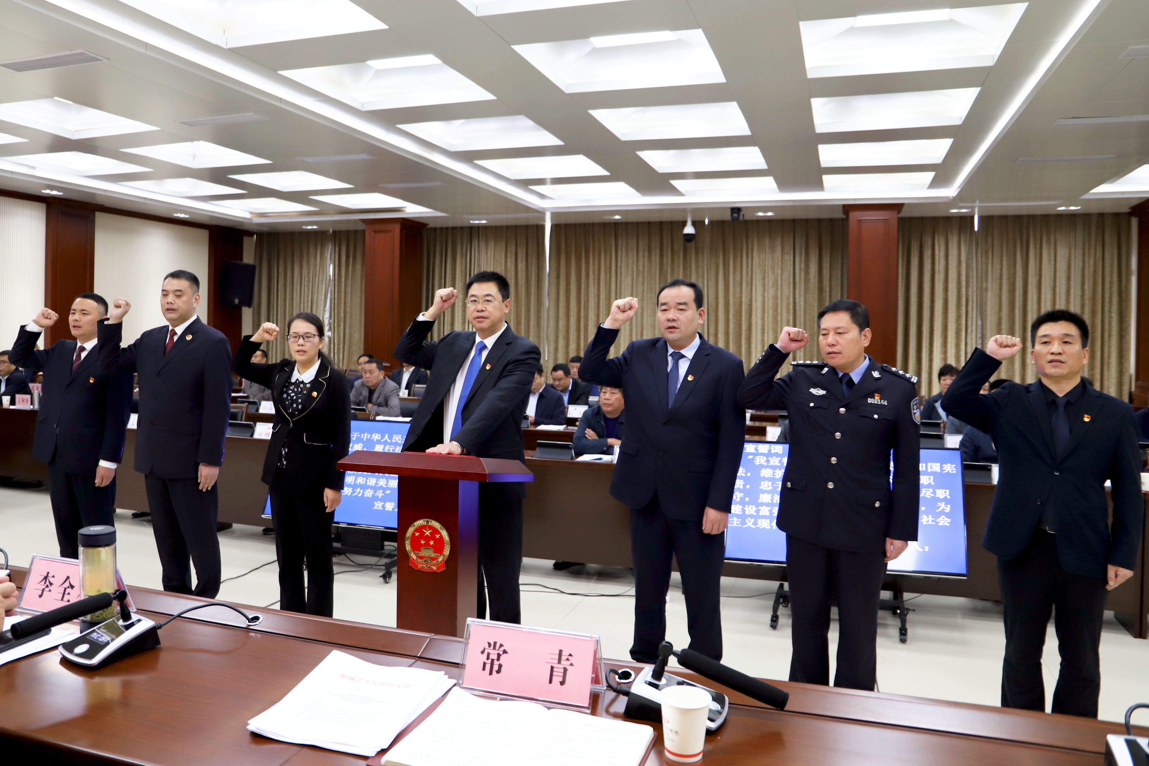 李建軍向新任命同志頒發(fā)任命書;在縣人大常委會組成人員監(jiān)誓下,新任命的同志由常青領(lǐng)誓向憲法進行了宣誓。