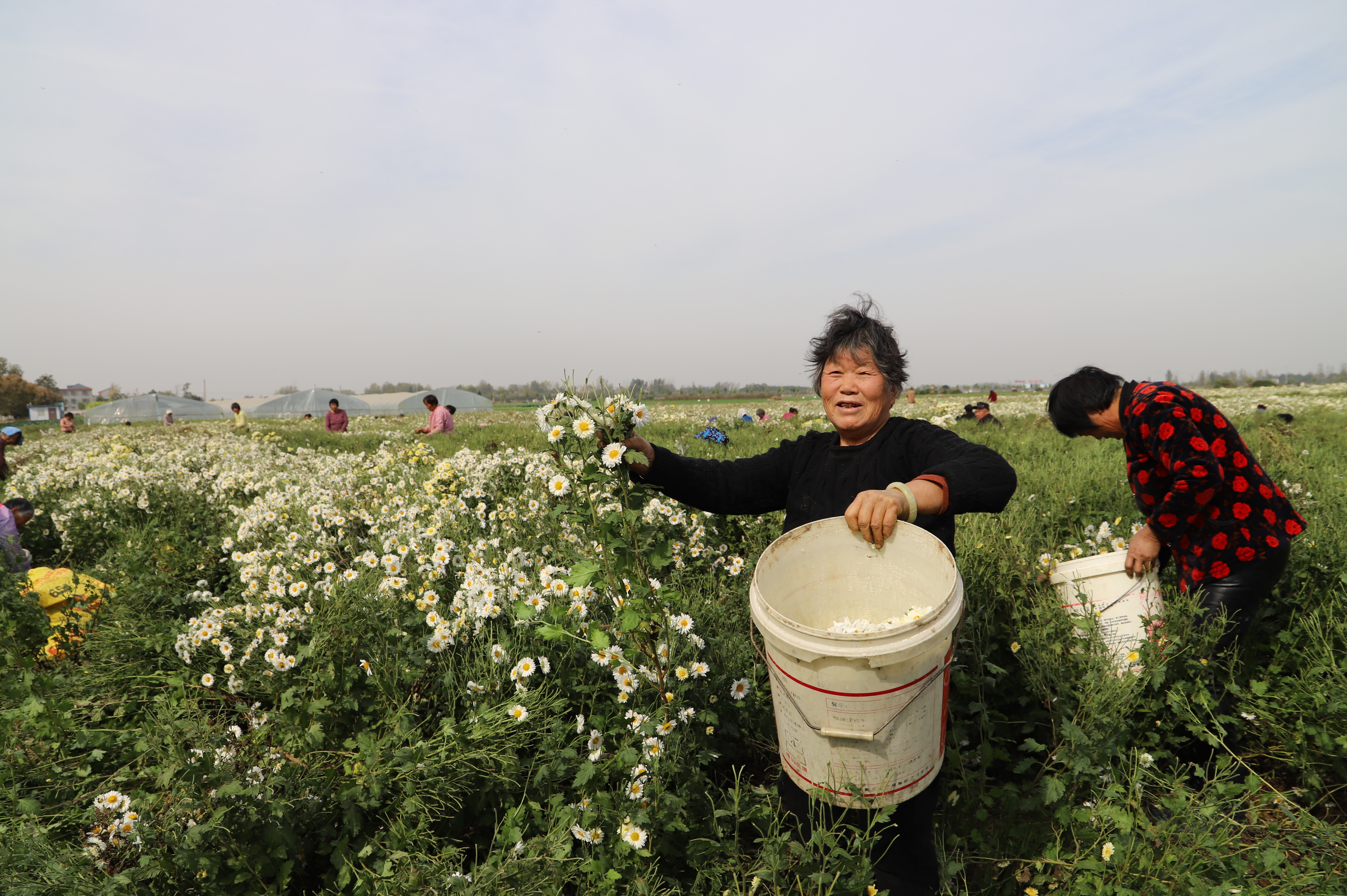 “她四十來(lái)歲,年輕手兒快,一天能摘300斤,掙100多元。”循著大家羨慕的眼光和手指的方向,記者來(lái)到晉潘潘身邊。果然,別人拿的都是塑料桶,她帶的是一個(gè)大編織袋,而且一人把持2米寬的地壟。只見她雙手順著菊花的莖向上一捋,滿滿兩把菊花應(yīng)聲而落,而且很少有碎花現(xiàn)象。聽著大家的夸贊,晉潘潘得意地說(shuō):“我掙錢多請(qǐng)大家喝菊花茶?!?/p>