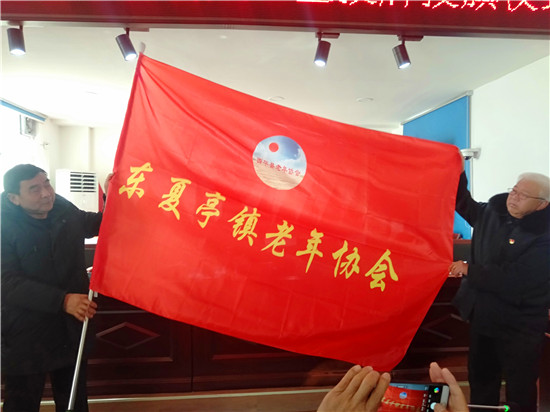 接著,張新芳代表縣老年協(xié)會向東夏亭鎮(zhèn)老年協(xié)會進(jìn)行授牌授旗。