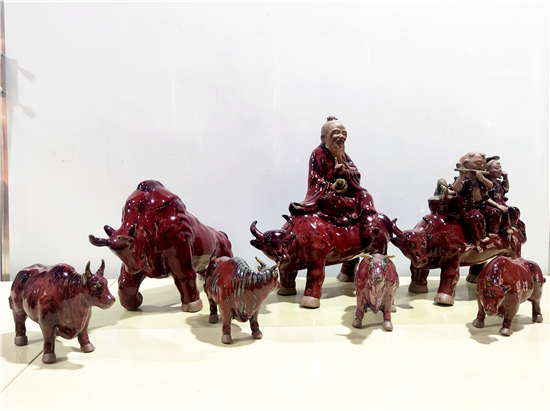 春節(jié)前夕,鄲城泥塑大師張振福歷時多日制作一組鈞瓷泥塑群雕《瑞牛賀新春》。該組作品分為三頭長約90厘米的大牛和若干頭小牛,均為鈞瓷泥塑,采用豫東黃泥和粗獷手法制作,上釉時入窯一色,歷經(jīng)1200多攝氏度高溫燒制后出窯萬變,十分精彩。拓荒牛精神,展現(xiàn)中國人自立自強的志氣;孺子牛精神,體現(xiàn)在創(chuàng)造美好生活的時代課題中;老黃牛精神,貴在“心有大我、至誠報國”的奉獻品格。