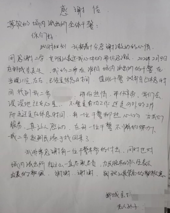 家屬告訴民警,老人去年剛做完手術(shù),身體存在一點(diǎn)問題。民警告知老人家屬今后要看管好老人,謹(jǐn)防走失,并為老人建立易走失人員檔案,以備兄弟單位使用,老人家屬對城內(nèi)派出所表示感謝并寫了一封感謝信。