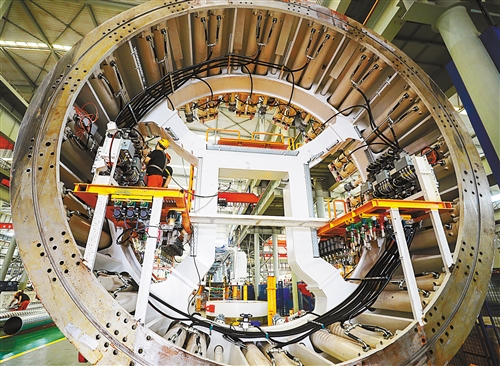 鄭州市經開區(qū)中鐵工程裝備集團有限公司生產車間,工人在加緊生產。2009年在鄭州成立的中鐵裝備,目前已是中國最大的隧道掘進機制造服務商。 聶冬晗攝(中經視覺)