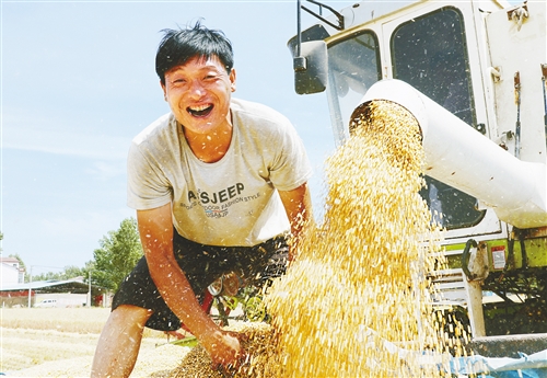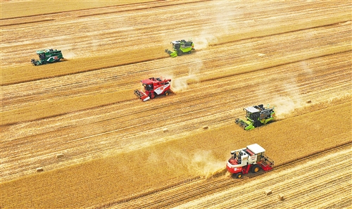 開封市尉氏縣邢莊鄉(xiāng)府李莊村,農機服務隊幫助村民收獲小麥。 李新義攝(中經視覺)