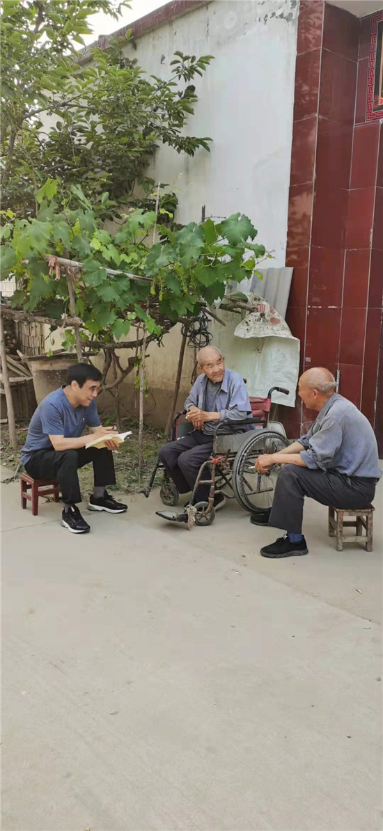 西華縣退役軍人事務(wù)局工作人員陪同薛景洪走訪知情老人。