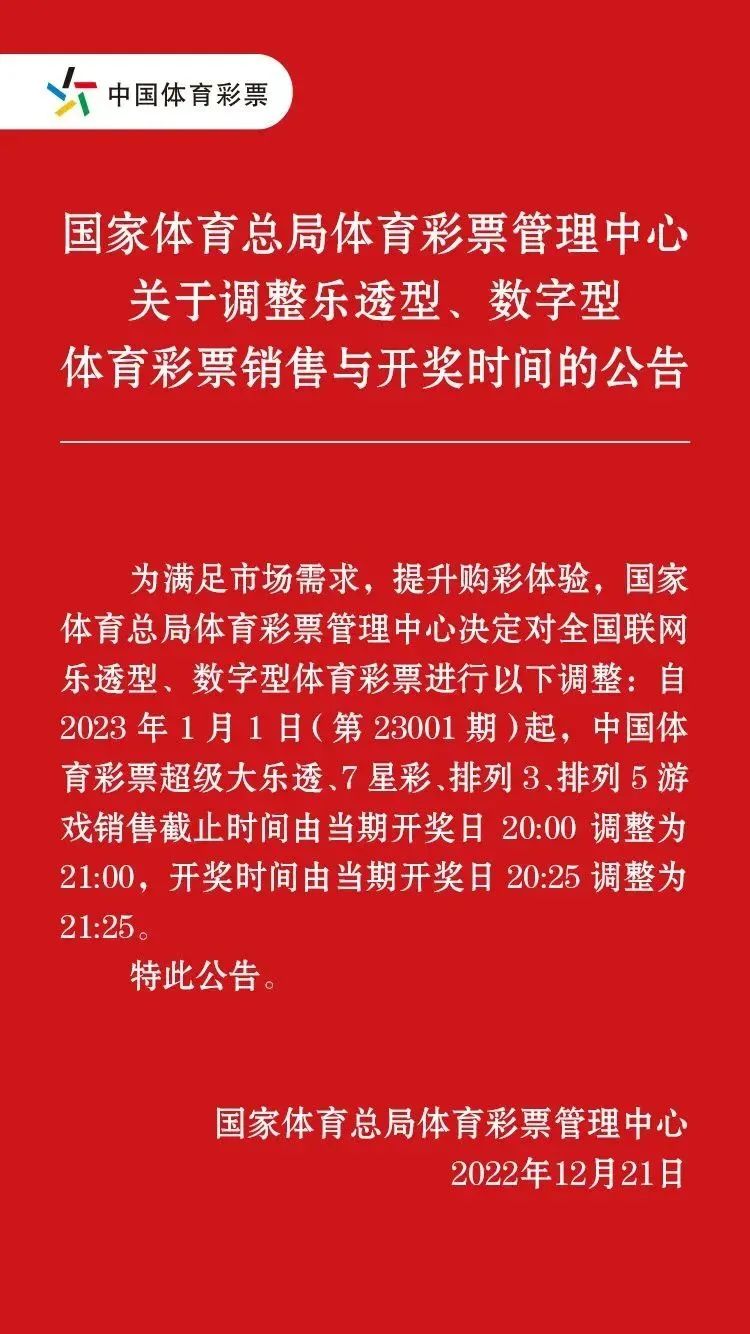 1月1日(第23001期)起,大樂(lè)透、7星彩、排列3、排列5游戲銷(xiāo)售截止時(shí)間由當(dāng)期開(kāi)獎(jiǎng)日20:00調(diào)整為21:00,開(kāi)獎(jiǎng)時(shí)間由當(dāng)期開(kāi)獎(jiǎng)日20:25調(diào)整為21:25。購(gòu)彩者可通過(guò)電視、廣播、網(wǎng)站、手機(jī)客戶(hù)端、報(bào)紙等渠道查閱開(kāi)獎(jiǎng)信息。