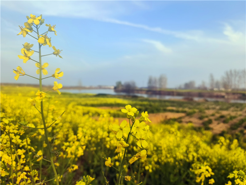 4月2日,春日明媚,沙潁河兩岸一片片金燦燦的油菜花“染黃”了大地,空氣中彌漫著香氣,大片的油菜花和漂亮的村居、田間勞作的農(nóng)民交織在一起,如詩(shī)如畫,美不勝收,讓人心曠神怡。