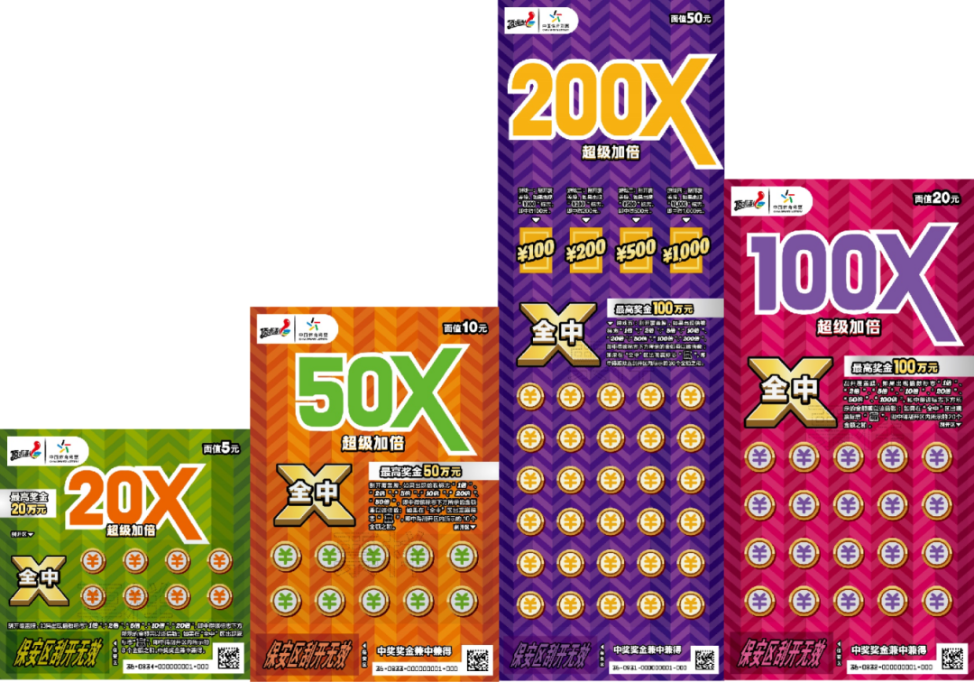 “超級(jí)加倍Ⅱ”系列主題即開票(面值:50元、20元、10元、5元)。