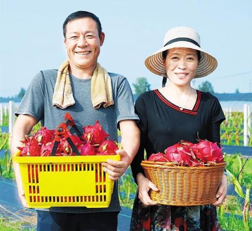 盛夏時(shí)節(jié),萬(wàn)木蔥蘢。在太康縣清集鎮(zhèn)夢(mèng)里田園火龍果種植基地,一株株仙人掌狀的火龍果成行排列,一個(gè)個(gè)飽滿(mǎn)的火龍果如火焰般垂掛枝頭。打扮利落的劉秀英邊用手機(jī)拍攝火龍果果皮上黃綠相間的鱗狀花萼,邊向粉絲介紹火龍果的長(zhǎng)勢(shì)和收成情況。
