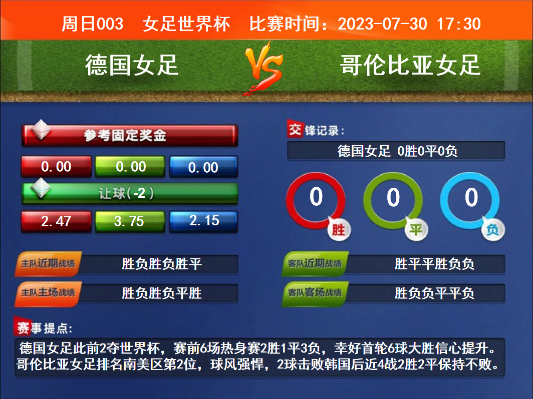 比賽時(shí)間:2023-07-30 17:30賽事提點(diǎn):德國女足此前2奪世界杯,賽前6場(chǎng)熱身賽2勝1平3負(fù),幸好首輪6球大勝信心提升。哥倫比亞女足排名南美區(qū)第2位,球風(fēng)強(qiáng)悍,2球擊敗韓國后近4戰(zhàn)2勝2平保持不敗。