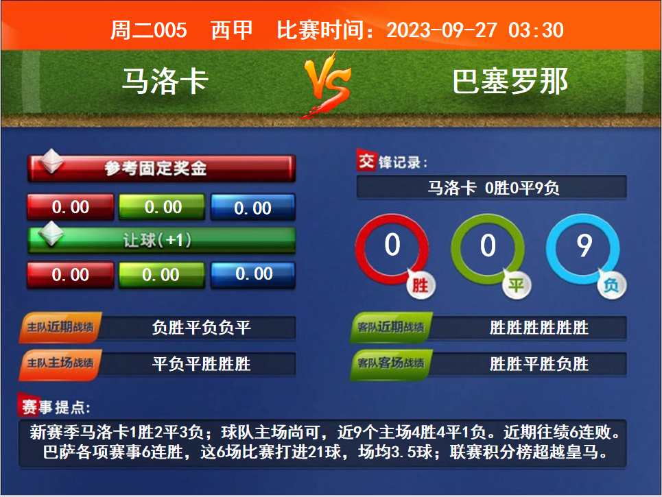 比賽時(shí)間:2023-09-27 03:30賽事提點(diǎn):新賽季馬洛卡1勝2平3負(fù);球隊(duì)主場(chǎng)尚可,近9個(gè)主場(chǎng)4勝4平1負(fù)。近期往績(jī)6連敗。巴薩各項(xiàng)賽事6連勝,這6場(chǎng)比賽打進(jìn)21球,場(chǎng)均3.5球;聯(lián)賽積分榜超越皇馬。
