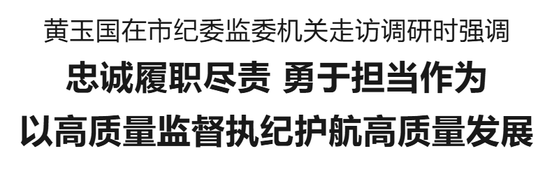 本報訊(記者 王艷) 12月5日,市委書記黃玉國到市紀委監(jiān)委機關走訪調(diào)研,強調(diào)要深入學習貫徹習近平總書記關于黨的自我革命的重要思想和在河南考察時重要講話精神,忠誠履職盡責,勇于擔當作為,不斷推動全面從嚴治黨、黨風廉政建設和反腐敗斗爭向縱深發(fā)展,以高質(zhì)量監(jiān)督執(zhí)紀護航高質(zhì)量發(fā)展。