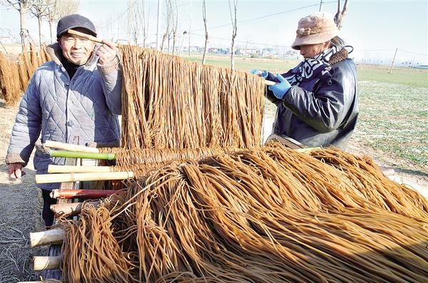1月12日,商水縣練集鎮(zhèn)農(nóng)民趁著晴好天氣晾曬粉條。作為當(dāng)?shù)貍鹘y(tǒng)優(yōu)質(zhì)農(nóng)產(chǎn)品,紅薯粉條是百姓餐桌上必不可少的美食。