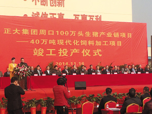 正大集團(tuán)周口100萬頭生豬產(chǎn)業(yè)鏈項(xiàng)目竣工投產(chǎn)儀式現(xiàn)場。