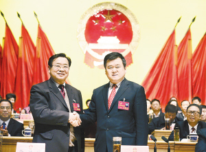右圖    新當(dāng)選的市人大常委會(huì)主任徐光與李洪民親切握手。(記者 沈湛 攝)