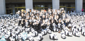 熊貓軍團(tuán)“占領(lǐng)”首爾      5月23日,在韓國首爾,展覽工作人員與紙制大熊貓合影。當(dāng)日,1600只紙制大熊貓?jiān)谖挥谑谞柺兄行牡氖雷谖幕瘯?huì)館前亮相?!凹堉拼笮茇埵澜缰谩被顒?dòng)創(chuàng)辦于2008年,由世界自然基金會(huì)和法國藝術(shù)家保羅·格蘭金聯(lián)合發(fā)起,以回收的廢紙和雞蛋殼為材料,設(shè)計(jì)制作1600只形態(tài)各異、表情豐富的大熊貓,目的是推廣保護(hù)大熊貓和民眾的環(huán)保意識(shí)。新華社發(fā)