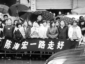 濤聲:2009年3月12日早晨,天空下著雨,上帝為失去一位好檢察官而哭泣!這天是鄲城人民的好兒子陳海宏出殯的日子!早晨8點(diǎn)20左右靈車駛?cè)胄氯A路。路兩邊站滿了送行的群眾,他們戴著白花,手拿條幅。靈車走得很慢,因?yàn)樗篮:旮绾芾?,好讓他多睡一會。海宏哥走好,你是鄲城的嬌傲?/p>