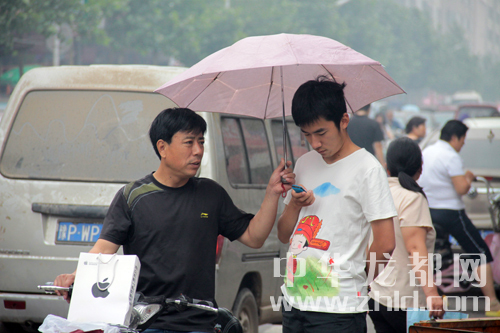 上午8點(diǎn)30分天空下起小雨一家長為考生撐起雨傘。