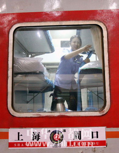 ????在K1505次列車13號(hào)車廂,記者見到了這節(jié)車廂的乘務(wù)員張靜逸。乘客一進(jìn)站登車,張靜逸的工作就開始了——為乘客檢票。真正的忙碌是在乘客上車后,張靜逸負(fù)責(zé)12號(hào)和13號(hào)兩個(gè)臥鋪車廂,每個(gè)車廂核載66人,列車開出后,她要先為乘客一一換票,然后,帶上手套,拿著塑料袋,來回穿梭在列車過道中清理車廂內(nèi)的垃圾。張靜逸一路上都在重復(fù)這些工作。