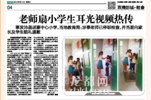 在等待調查結果的同時,記者通過網絡積極尋找與該視頻相關的信息。9月12日17時許,記者在當天的《彭城晚報》上看到一則標題為《老師扇小學生耳光視頻熱傳》的消息,報紙上刊登的圖片為視頻中的截圖。據報道,該事件發(fā)生在江蘇省徐州市沛縣胡寨中心小學。9月9日7時30許,胡寨中心小學老師吳某對沒有完成作業(yè)的3名學生進行體罰,后被人舉報。目前,涉事學校和老師已向家長和學生賠禮道歉。