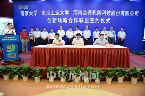 ????本報訊(記者 李莉) 7月9日上午,南京大學、南京工業(yè)大學、河南金丹乳酸科技股份有限公司創(chuàng)新戰(zhàn)略合作聯(lián)盟簽約儀式在鄭州舉行。副省長張維寧,中國工程院院士張全興,南京大學副校長談哲敏,南京工業(yè)大學副校長喬旭,省科技廳廳長張震宇,市委書記、市人大常委會主任徐光,省環(huán)保廳副廳長師偉,市委常委、常務副市長劉保倉,市委常委、組織部長靳磊,副市長王田業(yè),及鄲城縣主要領導、河南金丹乳酸公司主要負責人出席簽約儀式。