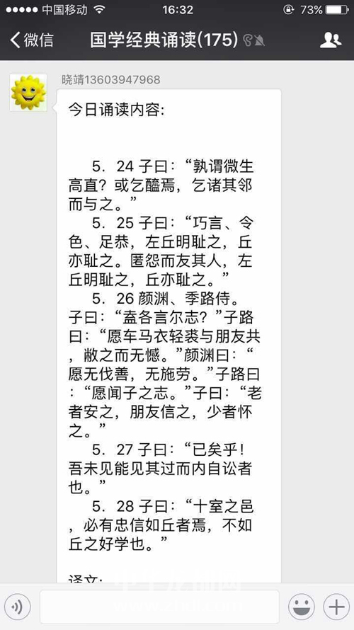 ????建立該微信群的是團市委工作人員劉曉靖。劉曉靖告訴周口晚報記者,建立該微信群的目的是想讓大家多讀讀國學(xué)經(jīng)典,增加大家的文學(xué)涵養(yǎng),讓大家養(yǎng)成讀書的習(xí)慣?!皠傞_始只有十幾個人,大家有些不好意思,有的人覺得自己讀得不好張不開口,我就做一些示范,引領(lǐng)大家誦讀。不久,加入微信群的人多了,通過幾個人帶動,大家誦讀的就多了?!眲跃刚f,讀的方式就是大家通過微信的語音功能,讀一些《論語》中的經(jīng)典句子。過了一段時間,大家對這種方式越來越認(rèn)可,加入該微信群的人也越來越多,人數(shù)從剛開始的十幾個人增加到近200人?,F(xiàn)在,該微信群里不但有電臺、電視臺的專業(yè)主持人,而且有一些學(xué)者。以前拿不準(zhǔn)的字,現(xiàn)在都會有人講解,大家也有了學(xué)習(xí)對象。這個微信群從成立到現(xiàn)在,《弟子規(guī)》、《大學(xué)》、《中庸》、《論語》已讀一遍,四書里面只剩下《孟子》還沒有讀。