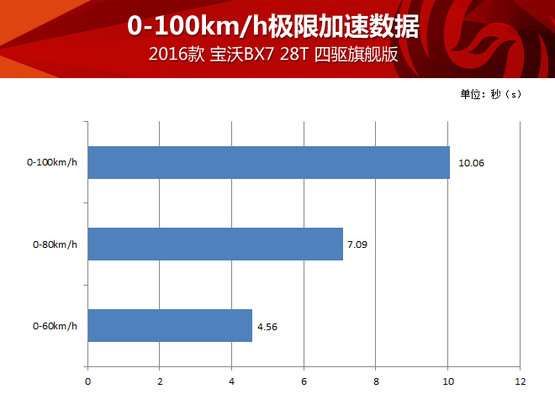由于有四驅(qū)系統(tǒng)保障,寶沃BX7四驅(qū)版車型在全力加速起步瞬間非常平穩(wěn),6AT變速器換擋還是平穩(wěn)優(yōu)先,所以全力加速時(shí)升檔也沒(méi)有太明顯的頓挫、動(dòng)力中斷或者不平順,整個(gè)過(guò)程很舒服,而10秒出頭的測(cè)試成績(jī)對(duì)于這臺(tái)2.0T動(dòng)力的中型SUV也很不錯(cuò),請(qǐng)別忘了因?yàn)榕c變速器的匹配,這臺(tái)2.0T發(fā)動(dòng)機(jī)的扭矩被限制在300牛頓·米,也就是說(shuō)這臺(tái)“高功率”發(fā)動(dòng)機(jī)其實(shí)并沒(méi)使出全力,我們完全有理由相信解除封印后它理應(yīng)跑得更快。