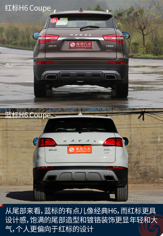 從車尾來(lái)看,個(gè)人認(rèn)為新款的紅標(biāo)好像比藍(lán)標(biāo)更加年輕,可能是設(shè)計(jì)年款導(dǎo)致的,新一些的設(shè)計(jì)更加年輕,當(dāng)然也不失沉穩(wěn),不過(guò)藍(lán)標(biāo)的H6 Coupe看起來(lái)確實(shí)更具個(gè)性。紅標(biāo)更符合大眾的審美。