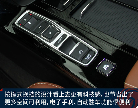 車內(nèi)采用了新的棕色真皮內(nèi)飾,而且還覺得缺了點什么。沒錯!之前的排擋桿不見了,取而代之的是按鍵式換擋機構(gòu),看上去更有科技感,控制區(qū)也更簡潔了。